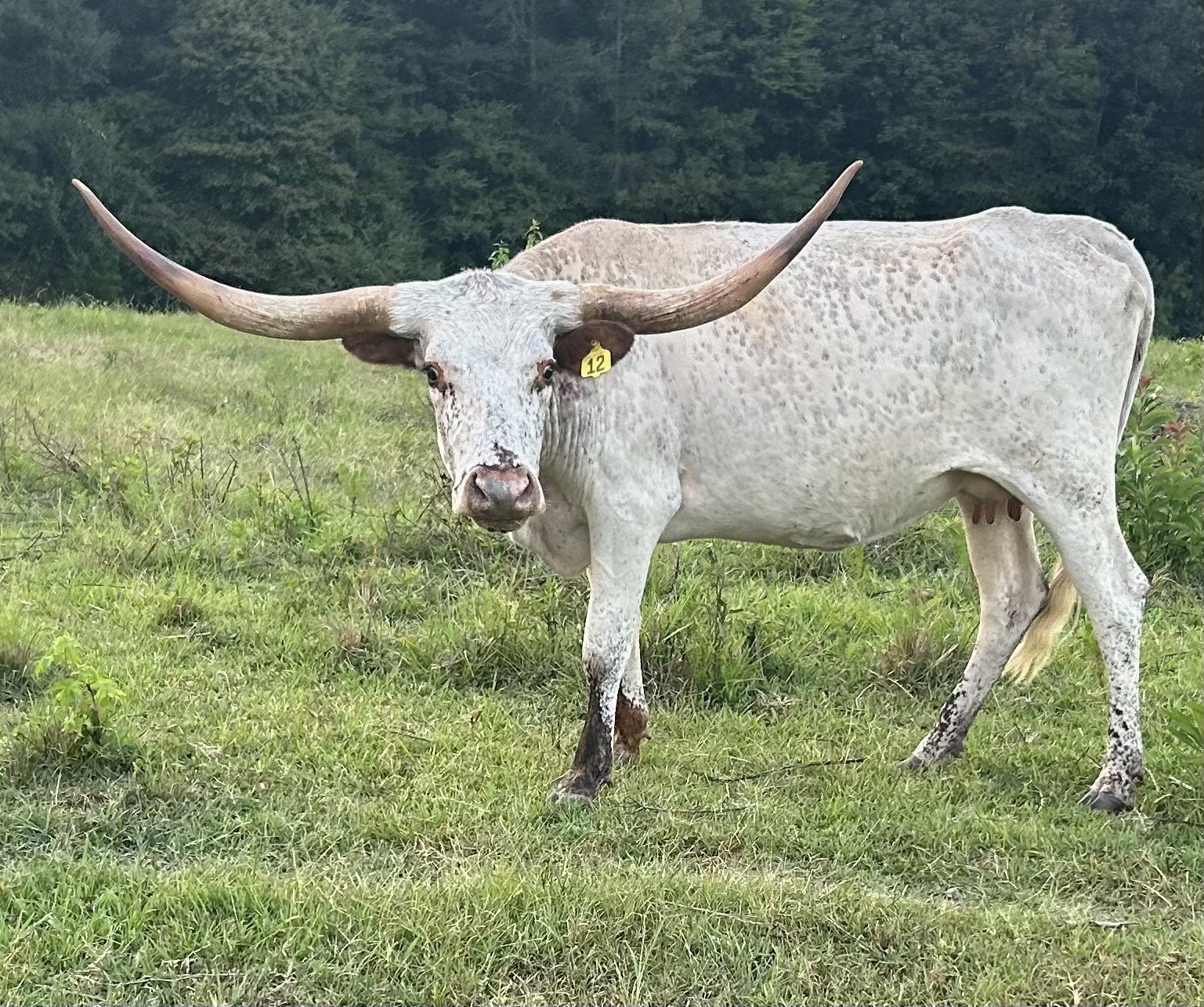 She is a gentle, tall, large framed daughter out of the original Day's Feisty Fannie cow, one of the largest TTT cows in the industry. Twisty horn genetics run deep in her pedigree. She produced two nice embryo calves out of Cowboy Tuff Chex, Double T Longhorns is using the bull calf as their herd sire and we have retained the heifer as a replacement. Currently exposed to SW Tuff Hombre for 2018 spring calf.